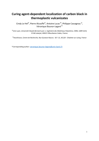Résumé : PP/EPDM Thermoplastic Vulcanizate (TPV) filled with carbon black (CB) has been prepared and the localization of the filler in the blend was depending on the crosslinking chemistry: in the rubber phase when the EPDM was crosslinked with phenolic resin (resol) and at the interface when the EPDM was crosslinked with dicumyl peroxide (DCP). It was proved, based on model reactions that mimicked what could happen during the process at high temperature, that DCP led to polymer chains grafting at the surface of the CB. This phenomenon was additional to the classical EPDM crosslinking and PP β-scission reactions. These reactions involved a modification of the interfacial tensions within this ternary blend, and explained preferentially the carbon black localization at the interface between the PP and the EPDM.