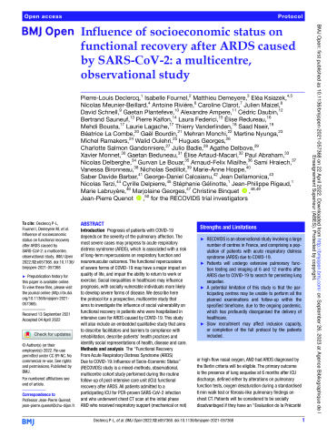 Résumé : Introduction: Prognosis of patients with COVID-19 depends on the severity of the pulmonary affection. The most severe cases may progress to acute respiratory distress syndrome (ARDS), which is associated with a risk of long-term repercussions on respiratory function and neuromuscular outcomes. The functional repercussions of severe forms of COVID-19 may have a major impact on quality of life, and impair the ability to return to work or exercise. Social inequalities in healthcare may influence prognosis, with socially vulnerable individuals more likely to develop severe forms of disease. We describe here the protocol for a prospective, multicentre study that aims to investigate the influence of social vulnerability on functional recovery in patients who were hospitalised in intensive care for ARDS caused by COVID-19. This study will also include an embedded qualitative study that aims to describe facilitators and barriers to compliance with rehabilitation, describe patients' health practices and identify social representations of health, disease and care. Methods and analysis: The "Functional Recovery From Acute Respiratory Distress Syndrome (ARDS) Due to COVID-19: Influence of Socio-Economic Status" (RECOVIDS) study is a mixed-methods, observational, multicentre cohort study performed during the routine follow-up of post-intensive care unit (ICU) functional recovery after ARDS. All patients admitted to a participating ICU for PCR-proven SARS-CoV-2 infection and who underwent chest CT scan at the initial phase AND who received respiratory support (mechanical or not) or high-flow nasal oxygen, AND had ARDS diagnosed by the Berlin criteria will be eligible. The primary outcome is the presence of lung sequelae at 6 months after ICU discharge, defined either by alterations on pulmonary function tests, oxygen desaturation during a standardised 6 min walk test or fibrosis-like pulmonary findings on chest CT. Patients will be considered to be socially disadvantaged if they have an "Evaluation de la Précarité et des Inégalités de santé dans les Centres d'Examen de Santé" (EPICES) score ≥30.17 at inclusion. Ethics and dissemination: The study protocol and the informed consent form were approved by an independent ethics committee (Comité de Protection des Personnes Sud Méditerranée II) on 10 July 2020 (2020-A02014-35). All patients will provide informed consent before participation. Findings will be published in peer-reviewed journals and presented at national and international congresses. Trial registration number: NCT04556513.