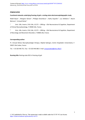 Résumé : Introduction: The pathophysiology of freezing of gait in people with Parkinson's disease (PD) remains unclear, despite its association with motor, cognitive, limbic and sensory-perceptual impairments. Resting-state electroencephalography (EEG) may provide functional information for a better understanding of freezing of gait by studying spectral power and connectivity between brain regions in different frequency bands.Methods: High-resolution EEG was recorded in 36 patients with PD (18 freezers, 18 non-freezers), and 18 healthy controls during a 5-min resting-state protocol with eyes open, followed by a basic spectral analysis in the sensor space and a more advanced analysis of functional connectivity at the source level.Results: Freezers showed a diffusely higher theta-band relative spectral power than controls. This increased power was correlated with a deficit in executive control. Concerning resting-state functional connectivity, connectivity strength within a left fronto-parietal network appeared to be higher in freezers than in controls in the theta band, and to be correlated with freezing severity and a history of falls.Conclusion: We have shown that spectral power and connectivity analyses of resting-state EEG provide useful and complementary information to better understand freezing of gait in PD. The higher connectivity strength seen within the left ventral attention network in freezers is in keeping with an excessive guidance of behavior by external cues, due to executive dysfunction, and spectral analysis also found changes in freezers that was closely correlated with executive control deficits. This exaggerated influence of the external environment might result in behavioral consequences that contribute to freezing of gait episodes. These findings should be further investigated with a longitudinal study.