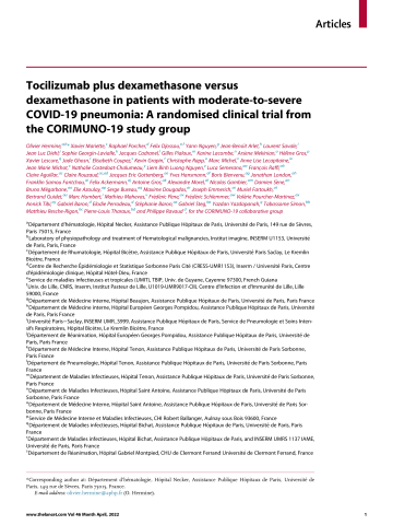 Résumé : Background: In moderate-to-severe COVID-19 pneumonia, dexamethasone (DEX) and tocilizumab (TCZ) reduce the occurrence of death and ventilatory support. We investigated the efficacy and safety of DEX+TCZ in an open randomized clinical trial. Methods: From July 24, 2020, through May 18, 2021, patients with moderate-to-severe COVID-19 pneumonia requiring oxygen (>3 L/min) were randomly assigned to receive DEX (10 mg/d 5 days tapering up to 10 days) alone or combined with TCZ (8 mg/kg IV) at day 1, possibly repeated with a fixed dose of 400 mg i.v. at day 3. The primary outcome was time from randomization to mechanical ventilation support or death up to day 14, analysed on an intent-to-treat basis using a Bayesian approach. ClinicalTrials.gov number, NCT04476979. Findings: A total of 453 patients were randomized, 3 withdrew consent, 450 were analysed, of whom 226 and 224 patients were assigned to receive DEX or TCZ+DEX, respectively. At day 14, mechanical ventilation or death occurred in 32/226 (14%) and 27/224 (12%) in the DEX and TCZ+DEX arms, respectively (hazard ratio [HR] 0·85, 90% credible interval [CrI] 0·55 to 1·31). At day 14, the World health Organization (WHO) clinical progression scale (CPS) was significantly improved in the TCZ+DEX arm (OR 0·69, 95% CrI, 0·49 to 0.97). At day 28, the cumulative incidence of oxygen supply independency was 82% in the TCZ+DEX arms and 72% in the DEX arm (HR 1·36, 95% CI 1·11 to 1·67). On day 90, 24 deaths (11%) were observed in the DEX arm and 18 (8%) in the TCZ+DEX arm (HR 0·77, 95% CI 0·42-1·41). Serious adverse events were observed in 25% and 21% in DEX and TCZ+DEX arms, respectively. Interpretation: Mechanical ventilation need and mortality were not improved with TCZ+DEX compared with DEX alone. The safety of both treatments was similar. However, given the wide confidence intervals for the estimate of effect, definitive interpretation cannot be drawn. Funding: Programme Hospitalier de Recherche Clinique [PHRC COVID-19-20-0151, PHRC COVID-19-20-0029], Fondation de l'Assistance Publique - Hôpitaux de Paris (Alliance Tous Unis Contre le Virus) and from Fédération pour la Recherche Médicale" (FRM). Tocilizumab was provided by Roche.