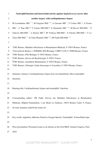 Résumé : Staphylococcus aureus is the main bacterial pathogen encountered in mediastinitis after cardiac surgical procedures; it remains a devastating complication with a high mortality rate. As neutrophils have a primordial role in the defense against staphylococcus infection and cardiopulmonary bypass (CPB) is known to induce immunosuppression, the aim of this study was to investigate CPB impact on neutrophil functions. Patients without known immunosuppression scheduled for cardiac surgery with CPB were included. Bone marrow and blood samples were harvested before, during, and after surgery. Neutrophil phenotypic maturation and functions (migration, adhesion, neutrophil extracellular trap [NET] release, reactive oxygen species (ROS) production, phagocytosis, and bacteria killing) were investigated. Two types of Staphylococcus aureus strains (one from asymptomatic nasal carriage and another from mediastinitis infected tissues) were used to assess in vitro bacterial direct impact on neutrophils. We found that CPB induced a systemic inflammation with an increase in circulating mature neutrophils after surgery. Bone marrow sample analysis did not reveal any modification of neutrophil maturation during CPB. Neutrophil lifespan was significantly increased and functions such as NET release and ROS production were enhanced after CPB whereas bacteria killing and phagocytosis were not impacted. Results were similar with the two different isolates of Staphylococcus aureus. These data suggest that CPB induces a recruitment of mature neutrophils via a demargination process rather than impacting their maturation in the bone marrow. In addition, neutrophils are fully efficient after CPB and do not contribute to postoperative immunosuppression.