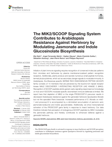 Résumé : Initiation of plant immune signaling requires recognition of conserved molecular patterns from microbes and herbivores by plasma membrane-localized pattern recognition receptors. Additionally, plants produce and secrete numerous small peptide hormones, termed phytocytokines, which act as secondary danger signals to modulate immunity. In Arabidopsis, the Brassicae -specific SERINE RICH ENDOGENOUS PEPTIDE (SCOOP) family consists of 14 members that are perceived by the leucine-rich repeat receptor kinase MALE DISCOVERER 1-INTERACTING RECEPTOR LIKE KINASE 2 (MIK2). Recognition of SCOOP peptides elicits generic early signaling responses but knowledge on how and if SCOOPs modulate specific downstream immune defenses is limited. We report here that depletion of MIK2 or the single PROSCOOP12 precursor results in decreased Arabidopsis resistance against the generalist herbivore Spodoptera littoralis but not the specialist Pieris brassicae. Increased performance of S. littoralis on mik2-1 and proscoop12 is accompanied by a diminished accumulation of jasmonic acid, jasmonate-isoleucine and indolic glucosinolates. Additionally, we show transcriptional activation of the PROSCOOP gene family in response to insect herbivory. Our data therefore indicate that perception of endogenous SCOOP peptides by MIK2 modulates the jasmonate pathway and thereby contributes to enhanced defense against a generalist herbivore.