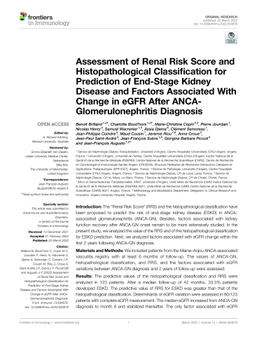 Résumé : Introduction The “Renal Risk Score” (RRS) and the histopathological classification have been proposed to predict the risk of end-stage kidney disease (ESKD) in ANCA-associated glomerulonephritis (ANCA-GN). Besides, factors associated with kidney function recovery after ANCA-GN onset remain to be more extensively studied. In the present study, we analyzed the value of the RRS and of the histopathological classification for ESKD prediction. Next, we analyzed factors associated with eGFR change within the first 2 years following ANCA-GN diagnosis. Materials and Methods We included patients from the Maine–Anjou ANCA-associated vasculitis registry with at least 6 months of follow-up. The values of ANCA-GN, histopathological classification, and RRS, and the factors associated with eGFR variations between ANCA-GN diagnosis and 2 years of follow-up were assessed. Results The predictive values of the histopathological classification and RRS were analyzed in 123 patients. After a median follow-up of 42 months, 33.3% patients developed ESKD. The predictive value of RRS for ESKD was greater than that of the histopathological classification. Determinants of eGFR variation were assessed in 80/123 patients with complete eGFR measurement. The median eGFR increased from ANCA-GN diagnosis to month 6 and stabilized thereafter. The only factor associated with eGFR variation in our study was eGFR at ANCA-GN diagnosis, with higher eGFR at diagnosis being associated with eGFR loss (p<0.001). Conclusion The RRS has a better predictive value for ESKD than the histopathological classification. The main determinant of eGFR variation at 2 years was eGFR at ANCA-GN diagnosis. Thus, this study suggests that eGFR recovery is poorly predicted by histological damage at ANCA-GN diagnosis.
