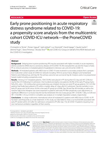Résumé : Background: Delaying time to prone positioning (PP) may be associated with higher mortality in acute respiratory distress syndrome (ARDS) due to coronavirus disease 2019 (COVID-19). We evaluated the use and the impact of early PP on clinical outcomes in intubated patients hospitalized in intensive care units (ICUs) for COVID-19. Methods: All intubated patients with ARDS due to COVID-19 were involved in a secondary analysis from a prospective multicenter cohort study of COVID-ICU network including 149 ICUs across France, Belgium and Switzerland. Patients were followed-up until Day-90. The primary outcome was survival at Day-60. Analysis used a Cox proportional hazard model including a propensity score. Results: Among 2137 intubated patients, 1504 (70.4%) were placed in PP during their ICU stay and 491 (23%) during the first 24 h following ICU admission. One hundred and eighty-one patients (36.9%) of the early PP group had a PaO2/FiO2 ratio > 150 mmHg when prone positioning was initiated. Among non-early PP group patients, 1013 (47.4%) patients had finally been placed in PP within a median delay of 3 days after ICU admission. Day-60 mortality in non-early PP group was 34.2% versus 39.3% in the early PP group (p = 0.038). Day-28 and Day-90 mortality as well as the need for adjunctive therapies was more important in patients with early PP. After propensity score adjustment, no significant difference in survival at Day-60 was found between the two study groups (HR 1.34 [0.96-1.68], p = 0.09 and HR 1.19 [0.998-1.412], p = 0.053 in complete case analysis or in multiple imputation analysis, respectively). Conclusions: In a large multicentric international cohort of intubated ICU patients with ARDS due to COVID-19, PP has been used frequently as a main treatment. In this study, our data failed to show a survival benefit associated with early PP started within 24 h after ICU admission compared to PP after day-1 for all COVID-19 patients requiring invasive mechanical ventilation regardless of their severity.
