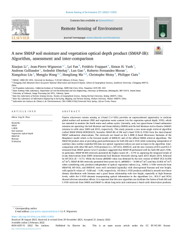 Résumé : Passive microwave remote sensing at L-band (1.4 GHz) provides an unprecedented opportunity to estimate global surface soil moisture (SM) and vegetation water content (via the vegetation optical depth, VOD), which are essential to monitor the Earth water and carbon cycles. Currently, only two space-borne L-band radiometer missions are operating: the Soil Moisture and Ocean Salinity (SMOS) and the Soil Moisture Active Passive (SMAP) missions in orbit since 2009 and 2015, respectively. This study presents a new mono-angle retrieval algorithm (called SMAP-INRAE-BORDEAUX, hereafter SMAP-IB) of SM and L-band VOD (L-VOD) from the dual-channel SMAP radiometric observations. The retrievals are based on the L-MEB (L-band Microwave Emission of the Biosphere) model which is the forward model of SMOS-IC and of the official SMOS retrieval algorithms. The SMAP-IB product aims at providing good performances for both SM and L-VOD while remaining independent of auxiliary data: neither modelled SM data nor optical vegetation indices are used as input in the algorithm. Inter-comparison with other SM and L-VOD products (i.e., MT-DCA, SMOS-IC, and the new versions of DCA and SCA-V extracted from SMAP passive Level 3 product) suggested that SMAP-IB performed well for both SM and L-VOD. In particular, SMAP-IB SM retrievals presented the higher scores (R = 0.74) in capturing the temporal trends of in-situ observations from ISMN (International Soil Moisture Network) during April 2015–March 2019, followed by MT-DCA (R = 0.71). While the lowest ubRMSD value was obtained by the new version of SMAP DCA (0.056 m3/m3), SMAP-IB SM retrievals presented best scores for R, ubRMSD (~ 0.058 m3/m3) and bias (0.002 m3/m3) when considering only products independent of optical vegetation indices (e.g., NDVI). L-VOD retrievals from SMAP-IB, MT-DCA, and SMOS-IC were well correlated (spatially) with aboveground biomass and tree height, with spatial R values of ~0.88 and ~ 0.90, respectively. All three L-VOD products exhibited a smooth non-linear density distribution with biomass and a good linear relationship with tree height, especially at high biomass levels, while the L-VOD datasets incorporating optical information in the algorithms (i.e., SCA-V and DCA) showed obvious saturation effects. It is expected that this new algorithm can facilitate the fusion of both SM and L-VOD retrievals from SMOS and SMAP to obtain long-term and continuous L-band earth observation products.ion