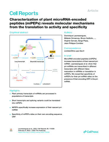 Résumé : MicroRNAs (miRNAs) are transcribed as long primary transcripts (pri-miRNAs) by RNA polymerase II. Plant pri-miRNAs encode regulatory peptides called miPEPs, which specifically enhance the transcription of the pri-miRNA from which they originate. However, paradoxically, whereas miPEPs have been identified in different plant species, they are poorly conserved, raising the question of the mechanisms underlying their specificity. To address this point, we identify and re-annotate multiple Arabidopsis thaliana pri-miRNAs in order to identify ORF encoding miPEPs. The study of several identified miPEPs in different species show that non-conserved miPEPs are only active in their plant of origin, whereas conserved ones are active in different species. Finally, we find that miPEP activity relies on the presence of its own miORF, explaining both the lack of selection pressure on miPEP sequence and the ability for non-conserved peptides to play a similar role, i.e., to activate the expression of their corresponding miRNA.