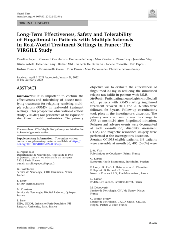 Résumé : Introduction: It is important to confirm the effectiveness and tolerability of disease-modifying treatments for relapsing-remitting multiple sclerosis (RRMS) in real-world treatment settings. This prospective observational cohort study (VIRGILE) was performed at the request of the French health authorities. The primary objective was to evaluate the effectiveness of fingolimod 0.5 mg in reducing the annualised relapse rate (ARR) in patients with RRMS. Methods: Participating neurologists enrolled all adult patients with RRMS starting fingolimod treatment between 2014 and 2016, who were followed for 3 years. Follow-up consultations took place at the investigator's discretion. The primary outcome measure was the change in ARR at month 24 after fingolimod initiation. Relapses and adverse events were documented at each consultation; disability assessment (EDSS) and magnetic resonance imagery were performed at the investigator's discretion. Results: Of 1055 eligible patients, 633 patients were assessable at month 36; 405 (64.0%) were treated continuously with fingolimod for 3 years. The ARR decreased from 0.92 ± 0.92 at inclusion to 0.31 ± 0.51 at month 24, a significant reduction of 0.58 [95% CI - 0.51 to - 0.65] relapses/year (p < 0.001). Since starting fingolimod, 461 patients (60.9%) remained relapse-free at month 24 and 366 patients (55.5%) at month 36. In multivariate analysis, no previous disease-modifying treatment, number of relapses in the previous year and lower EDSS score at inclusion were associated with a greater on-treatment reduction in ARR. The mean EDSS score remained stable over the course of the study. Sixty-one out of 289 (21.1%) patients presented new radiological signs of disease activity. Treatment-related serious adverse events were lymphopenia (N = 21), bradycardia (N = 19), elevated transaminases (N = 9) and macular oedema (N = 9). Conclusions: The effectiveness and tolerability of fingolimod in everyday clinical practice are consistent with findings of previous phase III studies. Our study highlights the utility of fingolimod for the long-term management of patients with multiple sclerosis.