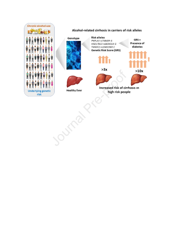 Résumé : Background & aims - Only a minority of excess alcohol drinkers develop cirrhosis. We developed and evaluated risk stratification scores to identify those at highest risk. Methods - Three cohorts (GenomALC-1: n = 1,690, GenomALC-2: n = 3,037, UK Biobank: relevant n = 6,898) with a history of heavy alcohol consumption (≥80 g/day (men), ≥50 g/day (women), for ≥10 years) were included. Cases were participants with alcohol-related cirrhosis. Controls had a history of similar alcohol consumption but no evidence of liver disease. Risk scores were computed from up to 8 genetic loci identified previously as associated with alcohol-related cirrhosis and 3 clinical risk factors. Score performance for the stratification of alcohol-related cirrhosis risk was assessed and compared across the alcohol-related liver disease spectrum, including hepatocellular carcinoma (HCC). Results - A combination of 3 single nucleotide polymorphisms (SNPs) (PNPLA3:rs738409, SUGP1-TM6SF2:rs10401969, HSD17B13:rs6834314) and diabetes status best discriminated cirrhosis risk. The odds ratios (ORs) and (95% CIs) between the lowest (Q1) and highest (Q2) score quintiles of the 3-SNP score, based on independent allelic effect size estimates, were 5.99 (4.18-8.60) (GenomALC-1), 2.81 (2.03-3.89) (GenomALC-2), and 3.10 (2.32-4.14) (UK Biobank). Patients with diabetes and high risk scores had ORs of 14.7 (7.69-28.1) (GenomALC-1) and 17.1 (11.3-25.7) (UK Biobank) compared to those without diabetes and with low risk scores. Patients with cirrhosis and HCC had significantly higher mean risk scores than patients with cirrhosis alone (0.76 ± 0.06 vs. 0.61 ± 0.02, p = 0.007). Score performance was not significantly enhanced by information on additional genetic risk variants, body mass index or coffee consumption. Conclusions - A risk score based on 3 genetic risk variants and diabetes status enables the stratification of heavy drinkers based on their risk of cirrhosis, allowing for the provision of earlier preventative interventions. Lay summary - Excessive chronic drinking leads to cirrhosis in some people, but so far there is no way to identify those at high risk of developing this debilitating disease. We developed a genetic risk score that can identify patients at high risk. The risk of cirrhosis is increased >10-fold with just two risk factors - diabetes and a high genetic risk score. Risk assessment using this test could enable the early and personalised management of this disease in high-risk patients.