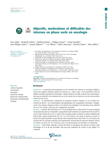 Résumé : Introduction > L'Association d'enseignement et de recherche des internes en oncologie (AERIO) a mené une enquête nationale auprès des internes en « phase socle » de la promotion 2020 du diplôme d'études spécialisées d'oncologie. L'objectif était de recueillir et décrire leurs motivations, ainsi que les objectifs et les obstacles de vie et de carrière de ces internes, lors de cette première année de leur cursus. Méthodes > Un questionnaire comprenait 45 questions fermées réparties en six sections permettant de décrire : les caractéristiques démographiques de la population interrogée, l'engagement et les attentes cliniques et liées à la recherche des étudiants, leur formation, leurs objectifs de vie et de carrière, ainsi que leur engagement associatif. Résultats > Soixante-dix-huit internes sur 119 ont participé (66 %), dont 68 (87 %) ayant complété le questionnaire dans son intégralité. La population était constituée en majorité de femmes (60 %) avec un âge médian de 24 ans. Le choix entre oncologie option médicale ou option radiothérapie était le plus souvent indéterminé (87 %), 15 % des internes ont songé au droit au remord. Le temps de travail hospitalier moyen déclaré était majoritairement situé entre 45 et 65 heures par semaine (83 %). Soixante-neuf pour cent souhaitaient s'investir dans la recherche clinique. Environ un interne sur deux (52 %) n'avait pas accès à la demi-journée de formation en autonomie. Conclusion > Cette étude nationale a permis de décrire la perception des internes en phase socle d'oncologie vis à vis de leur formation, ainsi que leurs aspirations de carrière et leur rapport à la recherche.