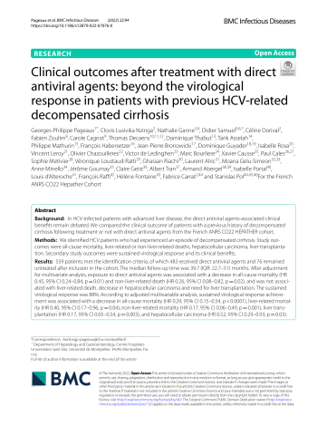 Résumé : BACKGROUND: In HCV-infected patients with advanced liver disease, the direct antiviral agents-associated clinical benefits remain debated. We compared the clinical outcome of patients with a previous history of decompensated cirrhosis following treatment or not with direct antiviral agents from the French ANRS CO22 HEPATHER cohort. METHODS: We identified HCV patients who had experienced an episode of decompensated cirrhosis. Study outcomes were all-cause mortality, liver-related or non-liver-related deaths, hepatocellular carcinoma, liver transplantation. Secondary study outcomes were sustained virological response and its clinical benefits. RESULTS: 559 patients met the identification criteria, of which 483 received direct antiviral agents and 76 remained untreated after inclusion in the cohort. The median follow-up time was 39.7 (IQR: 22.7-51) months. After adjustment for multivariate analysis, exposure to direct antiviral agents was associated with a decrease in all-cause mortality (HR 0.45, 95% CI 0.24-0.84, p = 0.01) and non-liver-related death (HR 0.26, 95% CI 0.08-0.82, p = 0.02), and was not associated with liver-related death, decrease in hepatocellular carcinoma and need for liver transplantation. The sustained virological response was 88%. According to adjusted multivariable analysis, sustained virological response achievement was associated with a decrease in all-cause mortality (HR 0.29, 95% CI 0.15-0.54, p < 0.0001), liver-related mortality (HR 0.40, 95% CI 0.17-0.96, p = 0.04), non-liver-related mortality (HR 0.17, 95% CI 0.06-0.49, p = 0.001), liver transplantation (HR 0.17, 95% CI 0.05-0.54, p = 0.003), and hepatocellular carcinoma (HR 0.52, 95% CI 0.29-0.93, p = 0.03). CONCLUSION: Treatment with direct antiviral agents is associated with reduced risk for mortality. The sustained virological response was 88%. Thus, direct antiviral agents treatment should be considered for any patient with HCV-related decompensated cirrhosis. TRIAL REGISTRATION: ClinicalTrials.gov registry number: NCT01953458.