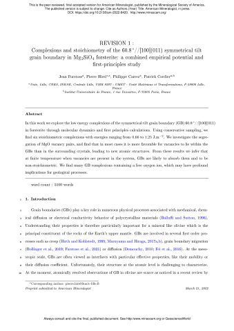 Complexions and stoichiometry of the 60.8°//[100](011) symmetrical tilt grain boundary in Mg2SiO4 forsterite: a combined empirical potential and first-principles study