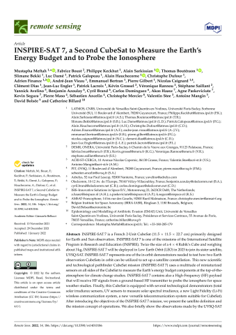 Résumé : INSPIRE-SAT 7 is a French 2-Unit CubeSat (11.5 × 11.5 × 22.7 cm) primarily designed for Earth and Sun observation. INSPIRE-SAT 7 is one of the missions of the International Satellite Program in Research and Education (INSPIRE). Twice the size of a 4 × 4 Rubik’s Cube and weighing about 3 kg, INSPIRE-SAT 7 will be deployed in Low Earth Orbit (LEO) in 2023 to join its sister satellite, UVSQ-SAT. INSPIRE-SAT 7 represents one of the in-orbit demonstrators needed to test how two Earth observation CubeSats in orbit can be utilized to set up a satellite constellation. This new scientific and technological pathfinder CubeSat mission (INSPIRE-SAT 7) uses a multitude of miniaturized sensors on all sides of the CubeSat to measure the Earth’s energy budget components at the top-of-the-atmosphere for climate change studies. INSPIRE-SAT 7 contains also a High-Frequency (HF) payload that will receive HF signals from a ground-based HF transmitter to probe the ionosphere for space weather studies. Finally, this CubeSat is equipped with several technological demonstrators (total solar irradiance sensors, UV sensors to measure solar spectral irradiance, a new Light Fidelity (Li-Fi) wireless communication system, a new versatile telecommunication system suitable for CubeSat). After introducing the objectives of the INSPIRE-SAT 7 mission, we present the satellite definition and the mission concept of operations. We also briefly show the observations made by the UVSQ-SAT CubeSat, and assess how two CubeSats in orbit could improve the information content of their Earth’s energy budget measurements. We conclude by reporting on the potential of future missions enabled by CubeSat constellations.