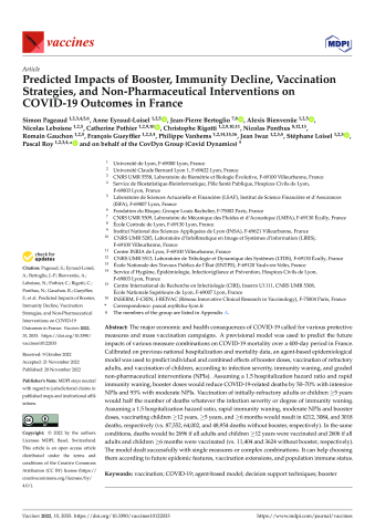 Résumé : The major economic and health consequences of COVID-19 called for various protective measures and mass vaccination campaigns. A previsional model was used to predict the future impacts of various measure combinations on COVID-19 mortality over a 400-day period in France. Calibrated on previous national hospitalization and mortality data, an agent-based epidemiological model was used to predict individual and combined effects of booster doses, vaccination of refractory adults, and vaccination of children, according to infection severity, immunity waning, and graded non-pharmaceutical interventions (NPIs). Assuming a 1.5 hospitalization hazard ratio and rapid immunity waning, booster doses would reduce COVID-19-related deaths by 50–70% with intensive NPIs and 93% with moderate NPIs. Vaccination of initially-refractory adults or children ≥5 years would half the number of deaths whatever the infection severity or degree of immunity waning. Assuming a 1.5 hospitalization hazard ratio, rapid immunity waning, moderate NPIs and booster doses, vaccinating children ≥12 years, ≥5 years, and ≥6 months would result in 6212, 3084, and 3018 deaths, respectively (vs. 87,552, 64,002, and 48,954 deaths without booster, respectively). In the same conditions, deaths would be 2696 if all adults and children ≥12 years were vaccinated and 2606 if all adults and children ≥6 months were vaccinated (vs. 11,404 and 3624 without booster, respectively). The model dealt successfully with single measures or complex combinations. It can help choosing them according to future epidemic features, vaccination extensions, and population immune status.