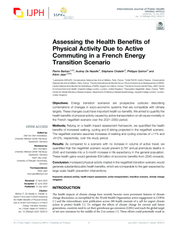Résumé : Objectives: Energy transition scenarios are prospective outlooks describing combinations of changes in socioeconomic systems that are compatible with climate targets. These changes could have important health co-benefits. We aimed to quantify the health benefits of physical activity caused by active transportation on all-cause mortality in the French negaWatt scenario over the 2021-2050 period. Methods; Relying on a health impact assessment framework, we quantified the health benefits of increased walking, cycling and E-biking projected in the negaWatt scenario. The negaWatt scenario assumes increases of walking and cycling volumes of +11% and +612%, respectively, over the study period. Results: As compared to a scenario with no increase in volume of active travel, we quantified that the negaWatt scenario would prevent 9,797 annual premature deaths in 2045 and translate into a 3-month increase in life expectancy in the general population. These health gains would generate €34 billion of economic benefits from 2045 onwards. Conclusion: Increased physical activity implied in the negaWatt transition scenario would generate substantial public health benefits, which are comparable to the gain expected by large scale health prevention interventions.