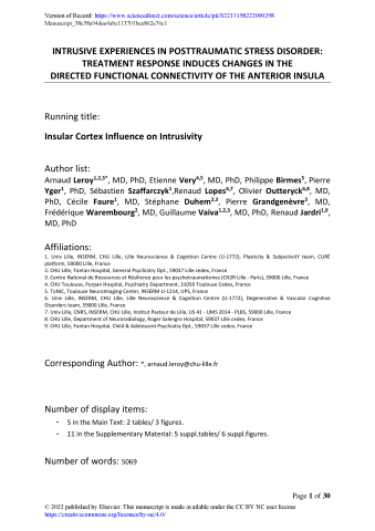 Résumé : Background: One of the core features of posttraumatic stress disorder (PTSD) is re-experiencing trauma. The anterior insula (AI) has been proposed to play a crucial role in these intrusive experiences. However, the dynamic function of the AI in re-experiencing trauma and its putative modulation by effective therapy need to be specified. Methods: Thirty PTSD patients were enrolled and exposed to traumatic memory reactivation therapy. Resting-state functional magnetic resonance imaging (fMRI) scans were acquired before and after treatment. To explore AI-directed influences over the rest of the brain, we referred to a mixed model using pre-/posttreatment Granger causality analysis seeded on the AI as a within-subject factor and treatment response as a between-subject factor. To further identify correlates of re-experiencing trauma, we investigated how intrusive severity affected (i) causality maps and (ii) the spatial stability of other intrinsic brain networks. Results: We observed changes in AI-directed functional connectivity patterns in PTSD patients. Many within- and between-network causal paths were found to be less influenced by the AI after effective therapy. Insular influences were found to be positively correlated with re-experiencing symptoms, while they were linked with a stronger default mode network (DMN) and more unstable central executive network (CEN) connectivity. Conclusion: We showed that directed changes in AI signaling to the DMN and CEN at rest may underlie the degree of re-experiencing symptoms in PTSD. A positive response to treatment further induced changes in network-to-network anticorrelated patterns. Such findings may guide targeted neuromodulation strategies in PTSD patients not suitably improved by conventional treatment.