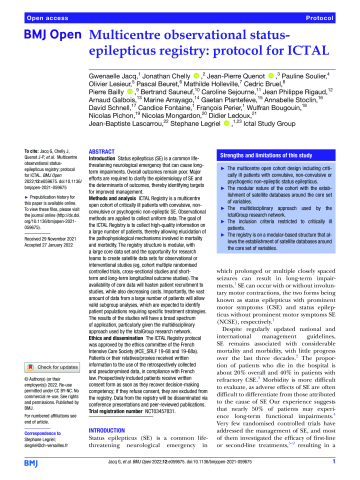 Résumé : Introduction Status epilepticus (SE) is a common life-threatening neurological emergency that can cause long-term impairments. Overall outcomes remain poor. Major efforts are required to clarify the epidemiology of SE and the determinants of outcomes, thereby identifying targets for improved management. Methods and analysis ICTAL Registry is a multicentre open cohort of critically ill patients with convulsive, non-convulsive or psychogenic non-epileptic SE. Observational methods are applied to collect uniform data. The goal of the ICTAL Registry is to collect high-quality information on a large number of patients, thereby allowing elucidation of the pathophysiological mechanisms involved in mortality and morbidity. The registry structure is modular, with a large core data set and the opportunity for research teams to create satellite data sets for observational or interventional studies (eg, cohort multiple randomised controlled trials, cross-sectional studies and short-term and long-term longitudinal outcome studies). The availability of core data will hasten patient recruitment to studies, while also decreasing costs. Importantly, the vast amount of data from a large number of patients will allow valid subgroup analyses, which are expected to identify patient populations requiring specific treatment strategies. The results of the studies will have a broad spectrum of application, particularly given the multidisciplinary approach used by the IctalGroup research network. Ethics and dissemination The ICTAL Registry protocol was approved by the ethics committee of the French Intensive Care Society (#CE_SRLF 19-68 and 19-68a). Patients or their relatives/proxies received written information to the use of the retrospectively collected and pseudonymised data, in compliance with French law. Prospectively included patients receive written consent form as soon as they recover decision-making competency; if they refuse consent, they are excluded from the registry. Data from the registry will be disseminated via conference presentations and peer-reviewed publications. Trial registration number NCT03457831.
