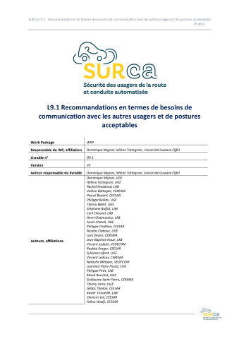 Résumé : L’objectif global du projet SURCA était de contribuer à une meilleure intégration des véhicules autonomes dans la circulation actuelle. Il s’est agi ainsi d’identifier quelles interactions existent et quelles stratégies pertinentes sont mises en place par les conducteurs, afin de faire des recommandations aux concepteurs de véhicules autonomes sur les besoins en termes d’interactions et en termes de comportement du véhicule autonome. Les travaux nous ont permis de faire une trentaine de recommandations (pour les pouvoirs publics ou les constructeurs) afin que l’introduction des VA en circulation réelle n’induise pas de nouveaux scénarios d’accidents. L’objectif de ce livrable est de recenser l’ensemble des recommandations proposées par les partenaires et validées collectivement. Ces recommandations ont été regroupées en six catégories présentées lors de la journée de clôture du projet. Formation Communication Sécurité passive Gestion des Cut-in sur autoroute Gestion des changements de voies sur autoroute VA et réglementation/règles de l'art Gestion des cyclistes aux carrefour à feux Gestion des piétons Adaptation du VA au contexte Gestion des situations complexes