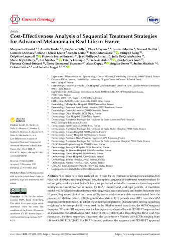 Résumé : Nine drugs have been marketed for 10 years for the treatment of advanced melanoma (AM). With half of patients reaching a second line, the optimal sequence of treatments remains unclear. To inform policy-makers about their efficiency, we performed a cost-effectiveness analysis of sequential strategies in clinical practice in France, for BRAF-mutated and wild-type patients. A multistate model was developed to describe treatment sequences, associated costs, and health outcomes over 10 years. Sequences, clinical outcomes, utility scores, and economic data were extracted from the prospective Melbase cohort, collecting individual data in 1518 patients since 2013, from their AM diagnosis until their death. To adjust the differences in patients’ characteristics among sequences, weighting by inverse probability was used. In the BRAF-mutated population, the MONO-targeted therapies (TT)-anti-PD1 sequence was the less expensive, whereas the anti-PD1-BI-TT sequence had an incremental cost-effectiveness ratio (ICER) of 180,441 EUR/QALY. Regarding the BRAF wild-type population, the three sequences constituted the cost-effective frontier, with ICERs ranging from 116 to 806,000 EUR/QALY. For BRAF-mutated patients, the sequence anti-PD1-BI-TT appeared to be the most efficient one in BRAF-mutated AM patients until 2018. Regarding the BRAF wild-type population until 2018, the sequence starting with IPI+NIVO appeared inefficient compared to anti-PD1, considering the extra cost for the QALY gained.