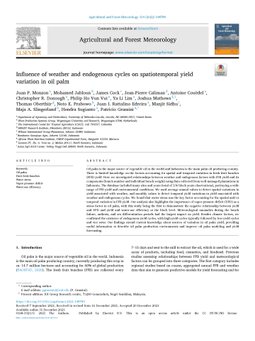 Résumé : Oil palm is the major source of vegetable oil in the world and Indonesia is the main palm oil producing country. There is limited knowledge on the factors accounting for spatial and temporal variation in fresh fruit bunches (FFB) yield. Here we investigated relationships between weather and endogenous factors with FFB yield and its components (bunch number and individual bunch weight) using data collected from well-managed plantations in Indonesia. The database included many sites and years (total of 136 block-years observations), portraying a wide range of FFB yield and environmental conditions. We used average annual values to detect spatial variations in yield associated with weather, and monthly values to detect temporal yield variations in yield associated with weather and endogenous cycles. We found that water stress was the key factor accounting for the spatial and/or temporal variation in FFB yield. Our analysis also highlights the importance of vapor pressure deficit (VPD) as a stress factor in oil palm, with this study being the first to demonstrate the negative relationship between yield and VPD and yield and water-use efficiency at the block level. Meteorological anomalies during the bunch failure, anthesis, and sex differentiation periods had the largest impact on yield. Besides climate factors, we confirmed the existence of endogenous yield cycles, with high-yield cycles typically followed by low-yield cycles and vice versa. Our findings extend current knowledge about sources of variation in oil palm yield, providing useful information to describe oil palm production environments and improve oil palm modeling and yield forecasting.