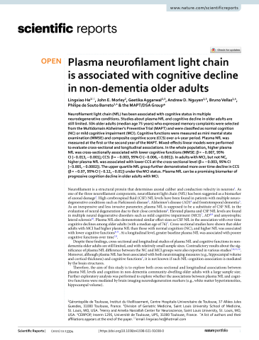 Lingxiao HeJohn MorleyGeetika AggarwalAndrew NguyenBruno VellasPhilipe Barreto de SoutoSophie GuyonnetIsabelle CarriéLauréane BrigitteCatherine FaisantFrançoise LalaJulien DelrieuHélène VillarsEmeline CombrouzeCarole BadufleAudrey ZuerasSandrine AndrieuChristelle CantetChristophe MorinGabor Abellan van KanCharlotte DupuyYves RollandCéline CaillaudPierre-Jean OussetSherry WillisSylvie BellevilleBrigitte Gilbert-DussardierFrancine FontaineJean-François DartiguesIsabelle MarcetFleur DelvaAlexandra FoubertSandrine CerdaMarie Noëlle-CuffiCorinne CostesOlivier RouaudPatrick ManckoundiaValérie QuipourtSophie MarilierEvelyne FranonLawrence BoriesMarie-Laure PaderMarie-France BassetBruno LapoujadeValérie FaureMichael Li Yung TongChristine Malick-LoiseauEvelyne Cazaban-CampistronFrançoise DesclauxColette BlatgeThierry DantoineCécile Laubarie-MouretIsabelle SaulnierJean-Pierre ClémentMarie-Agnès PicatLaurence Bernard-BourzeixStéphanie WilleboisIléana DésormaisNoëlle CardinaudMarc BonnefoyPierre LivetPascale RebaudetClaire GédéonCatherine BurdetFlavien TerracolAlain PesceStéphanie RothSylvie ChaillouSandrine LouchartKristel SudresNicolas LebrunNadège Barro-BelayguesJacques TouchonKarim BennysAudrey GabelleAurélia RomanoLynda TouatiCécilia MarelliCécile PaysPhilippe RobertFranck Le DuffClaire GervaisSébastien GonfrierYannick GasnierSerge BordesDanièle BegorreChristian CarpuatKhaled KhalesJean-François LefebvreSamira Misbah El IdrissiPierre SkolilJean‐pierre SallesCarole DufouilStéphane LehéricyMarie ChupinJean-François ManginAli BouhayiaMichèle AllardFrédéric RicolfiDominique DuboisMarie Paule Bonceour MartelFrançois CottonAlain BonaféStéphane ChanaletFrançoise HugonFabrice BonnevilleChristophe CognardFrançois CholletPierre PayouxThierry VoisinSophie PeifferAnne HitzelMichel ZancaJacques MonteilJacques DarcourtLaurent MolinierHélène DerumeauxNadège CostaBertrand PerretClaire VinelSylvie Caspar-BauguilPascale Olivier-AbbalNicola Coley