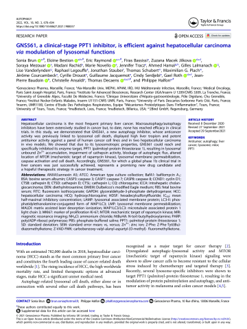 Résumé : Hepatocellular carcinoma is the most frequent primary liver cancer. Macroautophagy/autophagy inhibitors have been extensively studied in cancer but, to date, none has reached efficacy in clinical trials. In this study, we demonstrated that GNS561, a new autophagy inhibitor, whose anticancer activity was previously linked to lysosomal cell death, displayed high liver tropism and potent antitumor activity against a panel of human cancer cell lines and in two hepatocellular carcinoma in vivo models. We showed that due to its lysosomotropic properties, GNS561 could reach and specifically inhibited its enzyme target, PPT1 (palmitoyl-protein thioesterase 1), resulting in lysosomal unbound Zn 2+ accumulation, impairment of cathepsin activity, blockage of autophagic flux, altered location of MTOR (mechanistic target of rapamycin kinase), lysosomal membrane permeabilization, caspase activation and cell death. Accordingly, GNS561, for which a global phase 1b clinical trial in liver cancers was just successfully achieved, represents a promising new drug candidate and a hopeful therapeutic strategy in cancer treatment.
