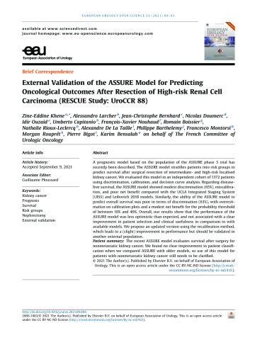 Résumé : A prognostic model based on the population of the ASSURE phase 3 trial has recently been described. The ASSURE model stratifies patients into risk groups to predict survival after surgical resection of intermediate-and high-risk localised kidney cancer. We evaluated this model in an independent cohort of 1372 patients using discrimination, calibration, and decision curve analysis. Regarding diseasefree survival, the ASSURE model showed modest discrimination (65%), miscalibration, and poor net benefit compared with the UCLA Integrated Staging System (UISS) and Leibovich 2018 models. Similarly, the ability of the ASSURE model to predict overall survival was poor in terms of discrimination (63%), with overestimation on calibration plots and a modest net benefit for the probability threshold of between 10% and 40%. Overall, our results show that the performance of the ASSURE model was less optimistic than expected, and not associated with a clear improvement in patient selection and clinical usefulness in comparison to with available models. We propose an updated version using the recalibration method, which leads to a (slight) improvement in performance but should be validated in another external population. Patient summary: The recent ASSURE model evaluates survival after surgery for nonmetastatic kidney cancer. We found no clear improvement in patient classification when we compared ASSURE with older models, so use of this model for patients with nonmetastatic kidney cancer still needs to be clarified.