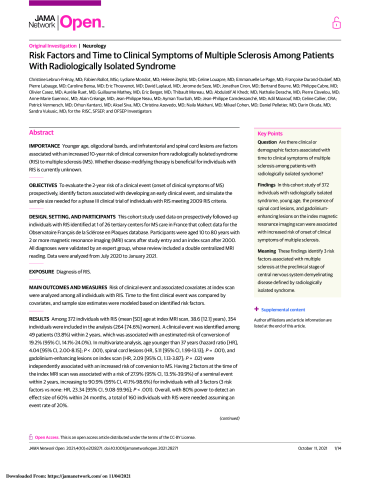 Résumé : IMPORTANCE: Younger age, oligoclonal bands, and infratentorial and spinal cord lesions are factors associated with an increased 10-year risk of clinical conversion from radiologically isolated syndrome (RIS) to multiple sclerosis (MS). Whether disease-modifying therapy is beneficial for individuals with RIS is currently unknown. OBJECTIVES: To evaluate the 2-year risk of a clinical event (onset of clinical symptoms of MS) prospectively, identify factors associated with developing an early clinical event, and simulate the sample size needed for a phase III clinical trial of individuals with RIS meeting 2009 RIS criteria. DESIGN, SETTING, AND PARTICIPANTS: This cohort study used data on prospectively followed-up individuals with RIS identified at 1 of 26 tertiary centers for MS care in France that collect data for the Observatoire Français de la Sclérose en Plaques database. Participants were aged 10 to 80 years with 2 or more magnetic resonance imaging (MRI) scans after study entry and an index scan after 2000. All diagnoses were validated by an expert group, whose review included a double centralized MRI reading. Data were analyzed from July 2020 to January 2021. EXPOSURE: Diagnosis of RIS. MAIN OUTCOMES AND MEASURES: Risk of clinical event and associated covariates at index scan were analyzed among all individuals with RIS. Time to the first clinical event was compared by covariates, and sample size estimates were modeled based on identified risk factors. RESULTS: Among 372 individuals with RIS (mean [SD] age at index MRI scan, 38.6 [12.1] years), 354 individuals were included in the analysis (264 [74.6%] women). A clinical event was identified among 49 patients (13.8%) within 2 years, which was associated with an estimated risk of conversion of 19.2% (95% CI, 14.1%-24.0%). In multivariate analysis, age younger than 37 years (hazard ratio [HR], 4.04 [95% CI, 2.00-8.15]; P < .001), spinal cord lesions (HR, 5.11 [95% CI, 1.99-13.13]; P = .001), and gadolinium-enhancing lesions on index scan (HR, 2.09 [95% CI, 1.13-3.87]; P = .02) were independently associated with an increased risk of conversion to MS. Having 2 factors at the time of the index MRI scan was associated with a risk of 27.9% (95% CI, 13.5%-39.9%) of a seminal event within 2 years, increasing to 90.9% (95% CI, 41.1%-98.6%) for individuals with all 3 factors (3 risk factors vs none: HR, 23.34 [95% CI, 9.08-59.96]; P < .001). Overall, with 80% power to detect an effect size of 60% within 24 months, a total of 160 individuals with RIS were needed assuming an event rate of 20%. CONCLUSIONS AND RELEVANCE: This study found that age younger than age 37 years, spinal cord involvement, and gadolinium-enhancing lesions on index MRI scan were associated with earlier clinical disease and relevant to the number of enrolled patients needed to detect a potential treatment effect.