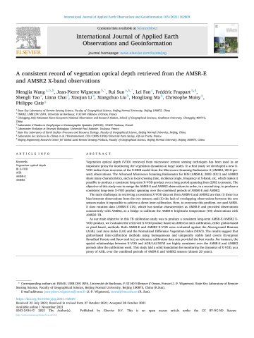 Résumé : Vegetation optical depth (VOD) retrieved from microwave remote sensing techniques has been used as an important proxy for monitoring the vegetation dynamics at large scales. In a first study we developed a new X-VOD indice from inversion of the X-MEB model from the Microwave Scanning Radiometer 2 (AMSR2, 2012-present) observations. The Advanced Microwave Scanning Radiometer for EOS (AMSR-E, 2002–2011) and AMSR2 share many characteristics, such as local crossing time, incidence angle, frequency at X-band, etc, which makes it possible to produce a consistent long-term X-VOD product over a long period spanning from 2002 to present. The objective of this study was to merge the AMSR-E and AMSR2 observations in order, in a second step, to produce a consistent long-term X-VOD product spanning over the combined periods of AMSR-E and AMSR2.The main challenges in retrieving a consistent X-VOD data set from AMSR-E and AMSR2 are that (i) there is a bias between observations from the two sensors; and (ii) the lack of overlapping observations between the two sensors makes it impossible to achieve a direct inter-calibration. Here, to overcome this problem, we used AMSR-E slow rotation data (AMSR-E L1S), which has similar characteristics as AMSR-E and provided observations concurrently with AMSR2, as a bridge to calibrate the AMSR-E brightness temperature (TB) observations with AMSR2 TB.As our main objective in this TB calibration study was to produce a consistent long-term AMSR-E/AMSR2 X-VOD product, we evaluated the retrieved X-VOD product based on different inter-calibration, either global-based or pixel-based, methods. Both AMSR-E and AMSR2 X-VOD were evaluated against the Aboveground Biomass (AGB), Leaf Area Index (LAI) and the Normalized Difference Vegetation Index (NDVI). The results suggest that global-based inter-calibration methods using homogeneous and temporally stable land covers (Evergreen Broadleaf Forests and Snow and Ice) as reference calibration data sets provided the best results. For instance, the spatial relationships between X-VOD and AGB/LAI/NDVI are highly consistent over the AMSR-E and AMSR2 periods after the calibration work. This study laid a solid foundation for monitoring the dynamics of X-VOD, as a proxy of AGB, over the combined periods of AMSR-E and AMSR2 sensors (almost 20 years).