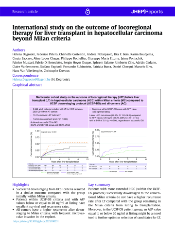 Résumé : BACKGROUND and AIMS: Good outcomes after liver transplantation (LT) have been reported after successfully downstaging to Milan criteria in more advanced hepatocellular carcinoma (HCC). We aimed to compare post-LT outcomes in patients receiving locoregional therapies (LRT) before LT according to Milan criteria and University of California San Francisco downstaging (UCSF-DS) protocol and ’all-comers’. METHODS: This multicentre cohort study included patients who received any LRT before LT from Europe and Latin America (2000-2018). We excluded patients with alpha-foetoprotein (AFP) above 1,000 ng/ml. Competing risk regression analysis for HCC recurrence was conducted, estimating subdistribution hazard ratios (SHRs) and corresponding 95% CIs. RESULTS: From 2,441 LT patients, 70.1% received LRT before LT (n = 1,711). Of these, 80.6% were within Milan, 12.0% within UCSF-DS, and 7.4% all-comers. Successful downstaging was achieved in 45.2% (CI 34.8-55.8) and 38.2% (CI 25.4-52.3) of the UCSF-DS group and all-comers, respectively. The risk of recurrence was higher for all-comers (SHR 6.01 [p <0.0001]) and not significantly higher for the UCSF-DS group (SHR 1.60 [p = 0.32]), compared with patients remaining within Milan. The all-comers presented more frequent features of aggressive HCC and higher tumour burden at explant. Among the UCSF-DS group, an AFP value of ≤20 ng/ml at listing was associated with lower recurrence (SHR 2.01 [p = 0.006]) and better survival. However, recurrence was still significantly high irrespective of AFP ≤20 ng/ml in all-comers. CONCLUSIONS: Patients within the UCSF-DS protocol at listing have similar post-transplant outcomes compared with those within Milan when successfully downstaged. Meanwhile, all-comers have a higher recurrence and inferior survival irrespective of response to LRT. Additionally, in the UCSF-DS group, an ALP of ≤20 ng/ml might be a novel tool to optimise selection of candidates for LT. CLINICAL TRIAL NUMBER: This study was registered as part of an open public registry (NCT03775863). LAY SUMMARY: Patients with more extended HCC (within the UCSF-DS protocol) successfully downstaged to the conventional Milan criteria do not have a higher recurrence rate after LT compared with the group remaining in the Milan criteria from listing to transplantation. Moreover, in the UCSF-DS patient group, an ALP value equal to or below 20 ng/ml at listing might be a novel tool to further optimise selection of candidates for LT.
