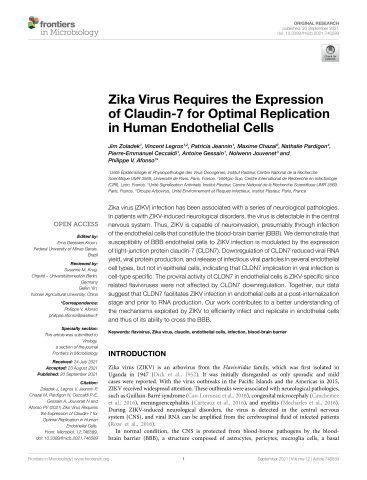 Résumé : Zika virus (ZIKV) infection has been associated with a series of neurological pathologies. In patients with ZIKV-induced neurological disorders, the virus is detectable in the central nervous system. Thus, ZIKV is capable of neuroinvasion, presumably through infection of the endothelial cells that constitute the blood-brain barrier (BBB). We demonstrate that susceptibility of BBB endothelial cells to ZIKV infection is modulated by the expression of tight-junction protein claudin-7 (CLDN7). Downregulation of CLDN7 reduced viral RNA yield, viral protein production, and release of infectious viral particles in several endothelial cell types, but not in epithelial cells, indicating that CLDN7 implication in viral infection is cell-type specific. The proviral activity of CLDN7 in endothelial cells is ZIKV-specific since related flaviviruses were not affected by CLDN7 downregulation. Together, our data suggest that CLDN7 facilitates ZIKV infection in endothelial cells at a post-internalization stage and prior to RNA production. Our work contributes to a better understanding of the mechanisms exploited by ZIKV to efficiently infect and replicate in endothelial cells and thus of its ability to cross the BBB.
