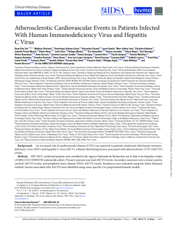 Résumé : Background: An increased risk of cardiovascular disease (CVD) was reported in patients coinfected with human immunodeficiency virus (HIV) and hepatitis C virus (HCV), without identifying factors associated with atherosclerotic CVD (ASCVD) events. Methods: HIV-HCV coinfected patients were enrolled in the Agence Nationale de Recherches sur le Sida et les hépatites virales (ANRS) CO13 HEPAVIH nationwide cohort. Primary outcome was total ASCVD events. Secondary outcomes were coronary and/or cerebral ASCVD events, and peripheral artery disease (PAD) ASCVD events. Incidences were estimated using the Aalen-Johansen method. Factors associated with ASCVD were identified using cause-specific Cox proportional hazards models. Results: At baseline, median age of the study population (N = 1213) was 45.4 (interquartile range [IQR] 42.1-49.0) years and 70.3% were men. After a median follow-up of 5.1 (IQR 3.9-7.0) years, the incidence was 6.98 (95% confidence interval [CI], 5.19-9.38) per 1000 person-years for total ASCVD events, 4.01 (2.78-6.00) for coronary and/or cerebral events, and 3.17 (2.05-4.92) for PAD ASCVD events. Aging (hazard ratio [HR] 1.06; 95% CI, 1.01-1.12), prior CVD (HR 8.48; 95% CI, 3.14-22.91), high total cholesterol (HR 1.43; 95% CI, 1.11-1.83), high-density lipoprotein cholesterol (HR 0.22; 95% CI, 0.08-0.63), statin use (HR 3.31; 95% CI, 1.31-8.38), and high alcohol intake (HR 3.18; 95% CI, 1.35-7.52) were independently associated with total ASCVD events, whereas undetectable baseline viral load (HR 0.41, 95% CI, 0.18-0.96) was associated with coronary and/or cerebral events. Conclusions: HIV-HCV coinfected patients experienced a high incidence of ASCVD events. Some traditional cardiovascular risk factors were the main determinants of ASCVD. Controlling cholesterol abnormalities and maintaining undetectable HIV RNA are essential to control cardiovascular risk.