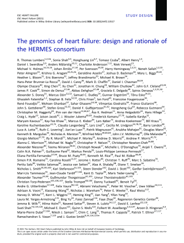 Résumé : Aims: The HERMES (HEart failure Molecular Epidemiology for Therapeutic targetS) consortium aims to identify the genomic and molecular basis of heart failure. Methods and results: The consortium currently includes 51 studies from 11 countries, including 68 157 heart failure cases and 949 888 controls, with data on heart failure events and prognosis. All studies collected biological samples and performed genome-wide genotyping of common genetic variants. The enrolment of subjects into participating studies ranged from 1948 to the present day, and the median follow-up following heart failure diagnosis ranged from 2 to 116 months. Forty-nine of 51 individual studies enrolled participants of both sexes; in these studies, participants with heart failure were predominantly male (34-90%). The mean age at diagnosis or ascertainment across all studies ranged from 54 to 84 years. Based on the aggregate sample, we estimated 80% power to genetic variant associations with risk of heart failure with an odds ratio of ≥1.10 for common variants (allele frequency ≥ 0.05) and ≥1.20 for low-frequency variants (allele frequency 0.01-0.05) at P < 5 × 10-8 under an additive genetic model. Conclusions: HERMES is a global collaboration aiming to (i) identify the genetic determinants of heart failure; (ii) generate insights into the causal pathways leading to heart failure and enable genetic approaches to target prioritization; and (iii) develop genomic tools for disease stratification and risk prediction.