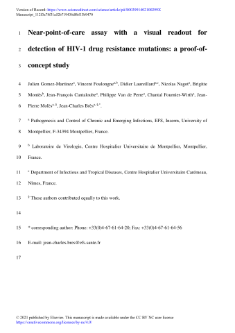Résumé : Human immunodeficiency virus (HIV) infection is a chronic disease that can be treated with antiretroviral (ARV) therapy. However, the success of this treatment has been jeopardized by the emergence of HIV infections resistant to ARV drugs. In low-to middle-income countries (LMICs), where transmission of resistant viruses has increased over the past decade, there is an urgent need to improve access to HIV drug resistance testing. Here, we present a proof-of-concept study of a rapid and simple molecular method to detect two major mutations (K103 N, Y181C) conferring resistance to first-line nonnucleoside reverse transcriptase inhibitor regimens. Our near-point-of-care (near-POC) diagnostic test, combining a sequence-specific primer extension and a lateral flow DNA microarray strip, allows visual detection of HIV drug resistance mutations (DRM) in a short turnaround time (4 h 30). The assay has a limit of detection of 100 copies of plasmid DNA and has a higher sensitivity than standard Sanger sequencing. The analytical performance was assessed by use of 16 plasma samples from individuals living with HIV-1 and results demonstrated the specificity and the sensitivity of this approach for multiplex detection of the two DRMs in a single test. Furthermore, this near-POC assay could be easily taylored to detect either new DRMs or DRM of from various HIV clades and might be useful for pre-therapy screening in LMICs with high levels of transmitted drug resistance.