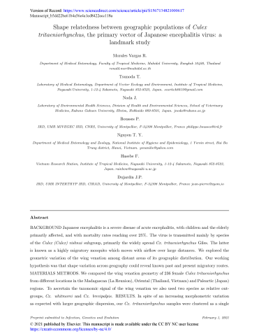 Résumé : Japanese encephalitis is a severe disease of acute encephalitis, with children and the elderly primarily affected, and with mortality rates reaching over 25%. The virus is transmitted mainly by species of the Culex (Culex) vishnui subgroup, primarily the widely spread Cx. tritaeniorhynchus Giles. The latter is known as a highly migratory mosquito which moves with airflow over large distances. We explored the geometric variation of the wing venation among distant areas of its geographic distribution. Our working hypothesis was that shape variation across geography could reveal known past and present migratory routes.