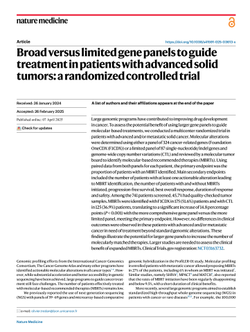 Résumé : Large genomic programs have contributed to improving drug development in cancer. To assess the potential benefit of using larger gene panels to guide molecular-based treatments, we conducted a multicenter randomized trial in patients with advanced and/or metastatic solid cancer. Molecular alterations were determined using either a panel of 324 cancer-related genes (Foundation OneCDX (F1CDX)) or a limited panel of 87 single-nucleotide/indel genes and genome-wide copy number variations (CTL) and reviewed by a molecular tumor board to identify molecular-based recommended therapies (MBRTs). Using paired data from both panels for each patient, the primary endpoint was the proportion of patients with an MBRT identified. Main secondary endpoints included the number of patients with at least one actionable alteration leading to MBRT identification, the number of patients with and without MBRTs initiated, progression-free survival, best overall response, duration of response and safety. Among the 741 patients screened, 45.7% had quality-checked tumor samples. MBRTs were identified with F1CDX in 175 (51.6%) patients and with CTL in 125 (36.9%) patients, translating to a significant increase of 14.8 percentage points (P < 0.001) with the more comprehensive gene panel versus the more limited panel, meeting the primary endpoint. However, no differences in clinical outcomes were observed in these patients with advanced and/or metastatic cancer in need of treatment beyond standard genomic alterations. These findings illustrate the potential for larger gene panels to increase the number of molecularly matched therapies. Larger studies are needed to assess the clinical benefit of expanded MBRTs. ClinicalTrials.gov registration: NCT03163732.