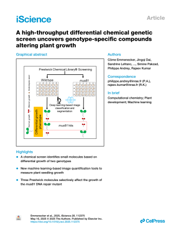 Résumé : Highlights • A chemical screen identifies small molecules based on differential growth of two genotypes • New machine learning-based image quantification tools to measure plant seedling growth • Three Prestwick molecules selectively affect the growth of the mus81 DNA repair mutant The identification of chemical compounds regulating plant growth in a genetic context can greatly enhance our understanding of biological mechanisms. Here, we have developed a high-throughput phenotypedirected chemical screening method in plants to compare two genotypes and identify small molecules inducing genotype-specific phenotypes. We used Arabidopsis thaliana wild type and mus81, a DNA repair mutant, and screened off-patent drugs from the Prestwick library to selectively identify molecules affecting mus81 growth. We developed two complementary convolutional neural networks (CNN)-based image segmentation and classification programs to quantify Arabidopsis seedling growth. Using these approaches, we detected that about 10% of Prestwick molecules cause altered growth in both genotypes, suggesting their toxic effects on plant growth. We identified three Prestwick molecules specifically affecting mus81. Overall, we developed a straightforward, accurate, and adaptable methodology for performing highthroughput screening of chemical libraries in a time-efficient manner, accelerating the discovery of genotype- specific chemical regulators of plant growth.