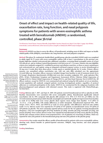 Résumé : Background: ANDHI was done to assess the efficacy of benralizumab, including onset of effect and impact on health-related quality of life (HRQOL), exacerbation rate, lung function, and nasal polyposis symptoms. Methods: This phase 3b, randomised, double-blind, parallel-group, placebo-controlled ANDHI study was completed in adults (aged 18–75 years) with severe eosinophilic asthma with at least 2 exacerbations in the previous year, despite high-dose inhaled corticosteroid plus additional controllers, screening blood eosinophil counts of at least 150 cells per μL, and an Asthma Control Questionnaire 6 (ACQ-6) score of 1·5 or more. Patients who met eligibility criteria were randomly assigned (2:1; stratified by previous exacerbation count [two, or three or more], maintenance oral corticosteroid use, and region), using an integrated web-based response system, to receive benralizumab at 30 mg every 8 weeks (first three doses given 4 weeks apart) or matched placebo for 24 weeks. Primary efficacy measure was annualised asthma exacerbation rate, with rate ratio (RR) calculated over the approximate 24-week follow-up. Secondary efficacy measures included change from baseline to end of treatment (week 24) in St George's Respiratory Questionnaire (SGRQ) total score (key secondary endpoint), FEV1, peak expiratory flow (PEF), ACQ-6, Predominant Symptom and Impairment Assessment (PSIA), Clinician Global Impression of Change (CGI-C), Patient Global Impression of Change (PGI-C), and Sino-Nasal Outcome Test-22 (SNOT-22). All efficacy analyses, except for SNOT-22, were summarised and analysed using the full analysis set on an intention-to-treat population (all randomly assigned patients receiving investigational product, regardless of protocol adherence or continued participation in the study). SNOT-22 was summarised for the subgroup of patients with physician-diagnosed nasal polyposis with informed consent. This study is registered with ClinicalTrials.gov, NCT03170271. Findings: Between July 7, 2017, and Sept 25, 2019, 656 patients received benralizumab (n=427) or placebo (n=229). Baseline characteristics were consistent with severe eosinophilic asthma. Benralizumab significantly reduced exacerbation risk by 49% compared with placebo (RR estimate 0·51, 95% CI 0·39–0·65; p<0·0001) over the 24-week treatment period and provided clinically meaningful and statistically significant improvement from baseline to week 24 in SGRQ total score versus placebo (least squares mean change from baseline −8·11 (95% CI −11·41 to −4·82; p<0·0001), with similar differences at earlier timepoints. Benralizumab improved FEV1, PEF, ACQ-6, CGI-C, PGI-C, PSIA, and SNOT-22 at week 24 versus placebo, with differences observed early (within weeks 1 to 4). Adverse events were reported for 271 (63%) of 427 patients on benralizumab versus 143 (62%) of 229 patients on placebo. The most commonly reported adverse events for the 427 patients receiving benralizumab (frequency >5%) were nasopharyngitis (30 [7%]), headache (37 [9%]), sinusitis (28 [7%]), bronchitis (22 [5%]), and pyrexia (26 [6%]). Fewer serious adverse events were reported for benralizumab (23 [5%]) versus placebo (25 [11%]), and the only common serious adverse event (experienced by >1% of patients) was worsening of asthma, which was reported for nine (2%) patients in the benralizumab group and nine (4%) patients in the placebo group. Interpretation: Our results extend the efficacy profile of benralizumab for patients with severe eosinophilic asthma, showing early clinical benefits in patient-reported outcomes, HRQOL, lung function, and nasal polyposis symptoms