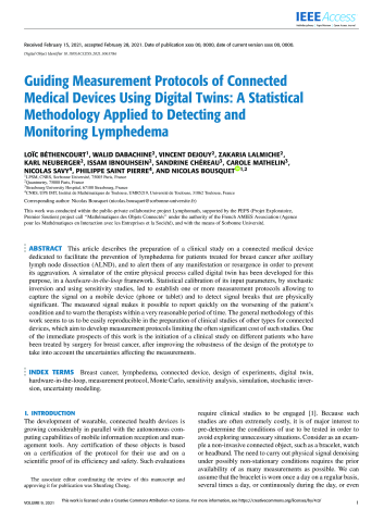 Résumé : This article describes the preparation of a clinical study on a connected medical device dedicated to facilitate the prevention of lymphedema for patients treated for breast cancer after axillary lymph node dissection (ALND), and to alert them of any manifestation or resurgence in order to prevent its aggravation. A simulator of the entire physical process called digital twin has been developed for this purpose, in a hardware-in-the-loop framework. Statistical calibration of its input parameters, by stochastic inversion and using sensitivity studies, led to establish one or more measurement protocols allowing to capture the signal on a mobile device (phone or tablet) and to detect signal breaks that are physically signicant. The measured signal makes it possible to report quickly on the worsening of the patient's condition and to warn the therapists within a very reasonable period of time. The general methodology of this work seems to us to be easily reproducible in the preparation of clinical studies of other types for connected devices, which aim to develop measurement protocols limiting the often signicant cost of such studies. One of the immediate prospects of this work is the initiation of a clinical study on different patients who have been treated by surgery for breast cancer, after improving the robustness of the design of the prototype to take into account the uncertainties affecting the measurements.
