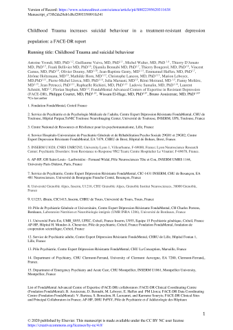 Résumé : Objective: In addition to heredity, exposure to early-life adversity is an important predisposing risk factor of suicidal behaviour. Although the association between Childhood Trauma (CT) and suicide risk is well documented, interactions between CT and suicidal behaviour in Treatment-Resistant Depression (TRD) populations have received little coverage. This study aimed to evaluate i) association between CT and suicidal behaviour in a TRD population, and ii) the role of personality traits and impulsiveness as potential factors of mediation in these associations. Methods: Patients were recruited from a cohort of the French network of TRD expert centers. Depressive symptom severity, CT, suicidal behaviour, personality traits, and impulsiveness were assessed with the Montgomery-Åsberg Depression Rating Scale (MADRS), the Childhood Trauma Questionnaire (CTQ), the Columbia Suicide Severity Rating Scale (CSSRS), the Structured Clinical Interview for DSM-IV, the Big Five Inventory, and the Barratt Impulsivness Scale (BIS) respectively. Results: Among the 256 patients with a baseline CTQ, in relation to suicide risk for the current depressive episode, we found an association with the total CTQ scores mediated by the intensity of the current episode in a model adjusted for age and sex (total effect: β = 0.171; p = 0.011, direct effect: β = 0.135; p = 0.043; indirect effect: β = 0.036; p = 0.048). Focusing on CT subtypes, we detected an association between suicide risk and physical neglect in a model adjusted for age and sex (β = 0.301; p = 0.002), without any mediation by the intensity of the current episode. There was no mediation effect from personality traits nor impulsiveness. With regards to CSSRS to assess suicidal ideation, we did not find any association with the total CTQ score and CT subtype scores. Conclusion: We report a strong association between suicidal behaviour and CT (in particular childhood physical neglect) in a TRD population.