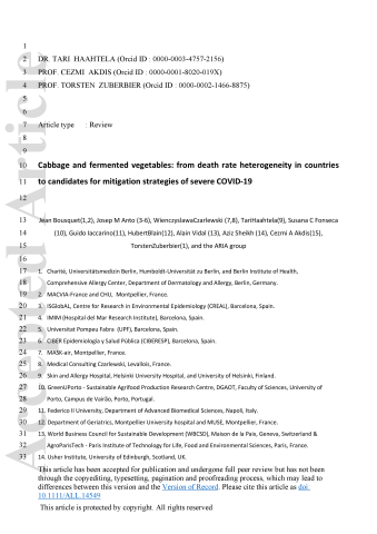 Résumé : Large differences in COVID-19 death rates exist between countries and between regions of the same country. Some very low death rate countries such as Eastern Asia, Central Europe, or the Balkans have a common feature of eating large quantities of fermented foods. Although biases exist when examining ecological studies, fermented vegetables or cabbage have been associated with low death rates in European countries. SARS-CoV-2 binds to its receptor, the angiotensin-converting enzyme 2 (ACE2). As a result of SARS-CoV-2 binding, ACE2 downregulation enhances the angiotensin II receptor type 1 (AT1 R) axis associated with oxidative stress. This leads to insulin resistance as well as lung and endothelial damage, two severe outcomes of COVID-19. The nuclear factor (erythroid-derived 2)-like 2 (Nrf2) is the most potent antioxidant in humans and can block in particular the AT1 R axis. Cabbage contains precursors of sulforaphane, the most active natural activator of Nrf2. Fermented vegetables contain many lactobacilli, which are also potent Nrf2 activators. Three examples are: kimchi in Korea, westernized foods, and the slum paradox. It is proposed that fermented cabbage is a proof-of-concept of dietary manipulations that may enhance Nrf2-associated antioxidant effects, helpful in mitigating COVID-19 severity.