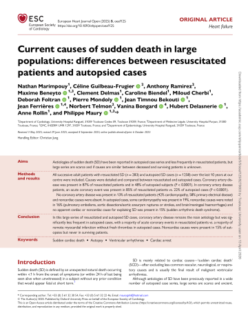 Résumé : Aims : Aetiologies of sudden death (SD) have been reported in autopsied case series and less frequently in resuscitated patients, but large series are scarce and if causes are similar between deceased and surviving patients is unknown.