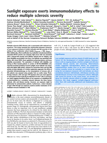 Résumé : Multiple sclerosis (MS) disease risk is associated with reduced sun-exposure. This study assessed the relationship between measures of sun exposure (vitamin D [vitD], latitude) and MS severity in the setting of two multicenter cohort studies (n NationMS = 946, n BIONAT = 990). Additionally, effect-modification by medication and photosensitivity-associated MC1R variants was assessed. High serum vitD was associated with a reduced MS severity score (MSSS), reduced risk for relapses, and lower disability accumulation over time. Low latitude was associated with higher vitD, lower MSSS, fewer gadolinium-enhancing lesions, and lower disability accumulation. The association of latitude with disability was lacking in IFN-β-treated patients. In carriers of MC1R:rs1805008(T), who reported increased sensitivity toward sunlight, lower latitude was associated with higher MRI activity, whereas for noncarriers there was less MRI activity at lower latitudes. In a further exploratory approach, the effect of ultraviolet (UV)-phototherapy on the transcriptome of immune cells of MS patients was assessed using samples from an earlier study. Phototherapy induced a vitD and type I IFN signature that was most apparent in monocytes but that could also be detected in B and T cells. In summary, our study suggests beneficial effects of sun exposure on established MS, as demonstrated by a correlative network between the three factors: Latitude, vitD, and disease severity. However, sun exposure might be detrimental for photosensitive patients. Furthermore, a direct induction of type I IFNs through sun exposure could be another mechanism of UV-mediated immune-modulation in MS.