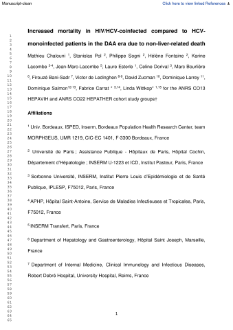Résumé : Background & aims: Direct-acting antivirals (DAA) lead to high sustained virological response (SVR) rates and decrease the risk of disease progression. We compared SVR rates and all-cause, liver- and non-liver-related deaths, liver-related events, and non-liver-related cancers in HIV/HCV-coinfected and HCV-monoinfected participants from 2 French cohort studies after initiation of DAA treatment. Methods: Up to 4 HCV-monoinfected participants from the ANRS CO22 HEPATHER cohort were matched by age and sex to each HIV/HCV-coinfected patient from the ANRS CO13 HEPAVIH cohort; both are nationwide, prospective, multicentre, and observational. Participants were initiated on DAAs between March 2014 and December 2017. Cox proportional hazards models adjusted by age, sex, duration since HCV diagnosis, HCV transmission routes, HCV genotypes, cirrhosis, tobacco, alcohol consumption, and SVR (time dependent) were used. Results: A total of 592 HIV/HCV-coinfected and 2,049 HCV-monoinfected participants were included; median age was 53.3 years (inter-quartile range: 49.6-56.9) and 52.9 years (49.6; 56.7), 1,498 (73.1%) and 436 (73.6%) were men, and 159 (28.8%) and 793 (41.2%) had cirrhosis, respectively. SVR was observed in 92.9% and 94.6%, respectively. HIV coinfection was associated with higher risk of all-cause death (hazard ratio [HR] 1.93; 95% CI 1.01-3.69), non-liver-related death (HR 2.84; 95% CI 1.27-6.36), and non-liver-related cancer (HR 3.26; 95% CI 1.50-7.08), but not with liver-related-death (HR 1.04; 95% CI 0.34-3.15) or liver-related events (HR 0.66; 95% CI 0.31-1.44). Conclusions: After DAA treatment, HIV-coinfected individuals had similar SVR rates and risk of liver-related deaths and events compared with HCV-monoinfected individuals, but had a higher risk of all-cause and non-liver-related deaths and non-liver-related cancers. Lay summary: We compared the risk of several clinical events in participants infected by human immunodeficiency virus and hepatitis C virus with those infected with hepatitis C virus alone, matched on age and sex, after treatment with contemporary direct-acting antivirals. We found a higher risk of all-cause deaths, non-liver-related deaths, and non-liver-related cancers in participants coinfected with the human immunodeficiency virus and hepatitis C virus, and no differences for the risk of liver-related deaths or events. Trial registration: ClinicalTrials.gov NCT03324633 NCT01953458.