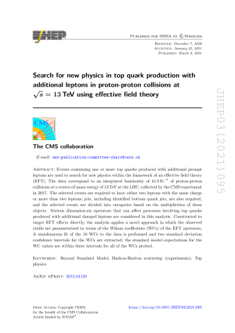 Résumé : Events containing one or more top quarks produced with additional prompt leptons are used to search for new physics within the framework of an effective field theory (EFT). The data correspond to an integrated luminosity of 41.5 fb$^{−1}$ of proton-proton collisions at a center-of-mass energy of 13 TeV at the LHC, collected by the CMS experiment in 2017. The selected events are required to have either two leptons with the same charge or more than two leptons; jets, including identified bottom quark jets, are also required, and the selected events are divided into categories based on the multiplicities of these objects. Sixteen dimension-six operators that can affect processes involving top quarks produced with additional charged leptons are considered in this analysis. Constructed to target EFT effects directly, the analysis applies a novel approach in which the observed yields are parameterized in terms of the Wilson coefficients (WCs) of the EFT operators. A simultaneous fit of the 16 WCs to the data is performed and two standard deviation confidence intervals for the WCs are extracted; the standard model expectations for the WC values are within these intervals for all of the WCs probed.[graphic not available: see fulltext]