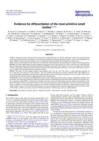 Résumé : Dynamical models of Solar System evolution have suggested that the so-called P-and D-type volatile-rich asteroids formed in the outer Solar System beyond Neptune's orbit and may be genetically related to the Jupiter Trojans, the comets and small Kuiper-belt objects (KBOs). Indeed, the spectral properties of P/D-type asteroids resemble that of anhydrous cometary dust. We aim at gaining insights into the above classes of bodies by characterizing the internal structure of a large P/D-type asteroid. Methods. We report high-angular-resolution imaging observations of P-type asteroid (87) Sylvia with VLT/SPHERE. These images were used to reconstruct the 3D shape of Sylvia. Our images together with those obtained in the past with large ground-based telescopes were used to study the dynamics of its two satellites. We also model Sylvia's thermal evolution. The shape of Sylvia appears flattened and elongated (a/b∼1.45 ; a/c∼1.84). We derive a volume-equivalent diameter of 271 ± 5 km, and a low density of 1378 ± 45 kg•m −3. The two satellites orbit Sylvia on circular, equatorial orbits. The oblateness of Sylvia should imply a detectable nodal precession which contrasts with the fully-Keplerian dynamics of its two satellites. This reveals an inhomogeneous internal structure, suggesting that Sylvia is differentiated. Sylvia's low density and differentiated interior can be explained by partial melting and mass redistribution through water percolation. The outer shell would be composed of material similar to interplanetary dust particles (IDPs) and the core similar to aqueously altered IDPs or carbonaceous chondrite meteorites such as the Tagish Lake meteorite. Numerical simulations of the thermal evolution of Sylvia show that for a body of such size, partial melting was unavoidable due to the decay of long-lived radionuclides. In addition, we show that bodies as small as 130-150 km in diameter should have followed a similar thermal evolution, while smaller objects, such as comets and the KBO Arrokoth, must have remained pristine, in agreement with in situ observations of these bodies. NASA Lucy mission target (617) Patroclus (diameter ≈140 km) may, however, be differentiated.