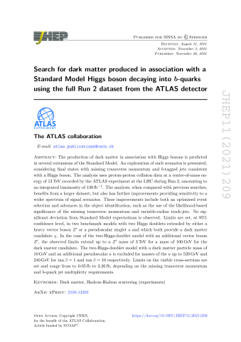 Résumé : The production of dark matter in association with Higgs bosons is predicted in several extensions of the Standard Model. An exploration of such scenarios is presented, considering final states with missing transverse momentum and b-tagged jets consistent with a Higgs boson. The analysis uses proton-proton collision data at a centre-of-mass energy of 13 TeV recorded by the ATLAS experiment at the LHC during Run 2, amounting to an integrated luminosity of 139 fb$^{-1}$. The analysis, when compared with previous searches, benefits from a larger dataset, but also has further improvements providing sensitivity to a wider spectrum of signal scenarios. These improvements include both an optimised event selection and advances in the object identification, such as the use of the likelihood-based significance of the missing transverse momentum and variable-radius track-jets. No significant deviation from Standard Model expectations is observed. Limits are set, at 95% confidence level, in two benchmark models with two Higgs doublets extended by either a heavy vector boson Z′ or a pseudoscalar singlet a and which both provide a dark matter candidate χ. In the case of the two-Higgs-doublet model with an additional vector boson Z′, the observed limits extend up to a Z′ mass of 3 TeV for a mass of 100 GeV for the dark matter candidate. The two-Higgs-doublet model with a dark matter particle mass of 10 GeV and an additional pseudoscalar a is excluded for masses of the a up to 520 GeV and 240 GeV for tan β = 1 and tan β = 10 respectively. Limits on the visible cross-sections are set and range from to 0.05 fb to 3.26 fb, depending on the missing transverse momentum and b-quark jet multiplicity requirements.[graphic not available: see fulltext]