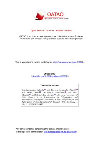 Résumé : The main environmental impact of olive oil production is the disposal of residues such as pomace and water vegetation. During the olive oil extraction process, the olive stone is milled and discharged within the olive pomace. However, olive stone flour can be valorized as filler for poly‐meric composites. A life cycle assessment of the olive pomace valorization was carried out by fo‐cusing on the manufacturing process of a biocomposite made of two different thermoplastic matri‐ces, i.e., polyethylene and polypropylene. The functional unit is the production of 1 m2 of a lath made of an olive pomace‐based biocomposite. The analysis was carried out with the SimaPro PhD 9.1.1.1 software, and the database used for the modeling was Ecoinvent 3.6. The obtained results reveal that the hotspot of the whole process is the twin‐screw compounding of the olive stone frac‐tion, with the polymeric matrix and coupling agent, and that human health is the most affected damage category. It represents 89% for both scenarios studied: olive stone fraction/polypropylene (OSF/PP) and olive stone fraction/polyethylene (OSF/PE). Further research directions include the use of biosourced polymer matrices, which could reduce the impact of olive pomace‐based compo‐site manufacturing.