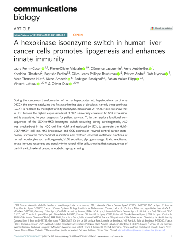 Résumé : During the cancerous transformation of normal hepatocytes into hepatocellular carcinoma (HCC), the enzyme catalyzing the first rate-limiting step of glycolysis, namely the glucokinase (GCK), is replaced by the higher affinity isoenzyme, hexokinase 2 (HK2). Here, we show that in HCC tumors the highest expression level of HK2 is inversely correlated to GCK expression, and is associated to poor prognosis for patient survival. To further explore functional consequences of the GCK-to-HK2 isoenzyme switch occurring during carcinogenesis, HK2 was knocked-out in the HCC cell line Huh7 and replaced by GCK, to generate the Huh7-GCK+/HK2? cell line. HK2 knockdown and GCK expression rewired central carbon metabolism, stimulated mitochondrial respiration and restored essential metabolic functions of normal hepatocytes such as lipogenesis, VLDL secretion, glycogen storage. It also reactivated innate immune responses and sensitivity to natural killer cells, showing that consequences of the HK switch extend beyond metabolic reprogramming.