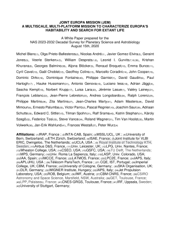 Résumé : In this White Paper we propose that NASA works with ESA and other potentially interested international partners to design and fly jointly an ambitious and exciting planetary mission to characterize Europa's habitability and search for bio-signatures in the environment of Europa (surface, subsurface and exosphere). A White Paper prepared for the NAS 2023-2032 Decadal Survey for Planetary Science and Astrobiology August 15th, 2020
