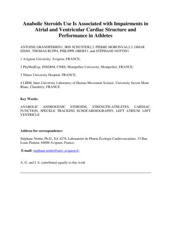 Résumé : Purpose: Despite potential severe cardiac side effects, anabolic androgenic steroids (AAS) are increasingly used by strength athletes. However, previous echocardiographic studies focused on the left ventricular strains (LV) but did not assess LV twist and untwist mechanics. Moreover, LA function has been often neglected, and its stiffness, an important determinant of LA reservoir function, has never been challenged. The aim of this study was to investigate the effects of anabolic androgenic steroids (AAS) on left atrial (LA) and left ventricular (LV) morphologies and functions in strength athletes. Methods: 50 subjects including 20 strength-trained young athletes aged 32.0 ± 8.5 years with a mean duration of AAS use of 4.7 ± 1.8 years (Users), 15 athletes with no history of AAS use (Non-Users) and 15 sedentary controls underwent STE to assess LA and LV morphology and function. Results: Users showed higher LA reservoir dysfunction than Non-Users (33.7 ± 10.9 vs 44.9 ± 9.9 % respectively, p = 0.004) and higher LA stiffness (0.13 ± 0.05 vs 0.19 ± 0.08 A.U. respectively, p = 0.02), higher LV mass index and lower global and regional LV diastolic and systolic dysfunction (global longitudinal strain: -15.5 ± 3.2 vs -18.9 ± 1.8 % respectively, p = 0.003), with a drop of LV twist-untwist mechanics (untwisting velocity: 61.5 ± 20.2 vs 73.7 ± 16.1 deg.s-1 respectively, p = 0.04). There were significant correlations between LV mass and LV apical rotation (p = 0.003, r = 0.44) and diastolic longitudinal strain rate (p = 0.015, r = 0.33). Conclusion: Our results showing significant LA and LV remodeling and dysfunctions in young AAS using athletes are alarming. Screening echocardiography based on STE parameters for early diagnosis, as well as a stronger awareness in athletes and in physicians are warranted in this context.